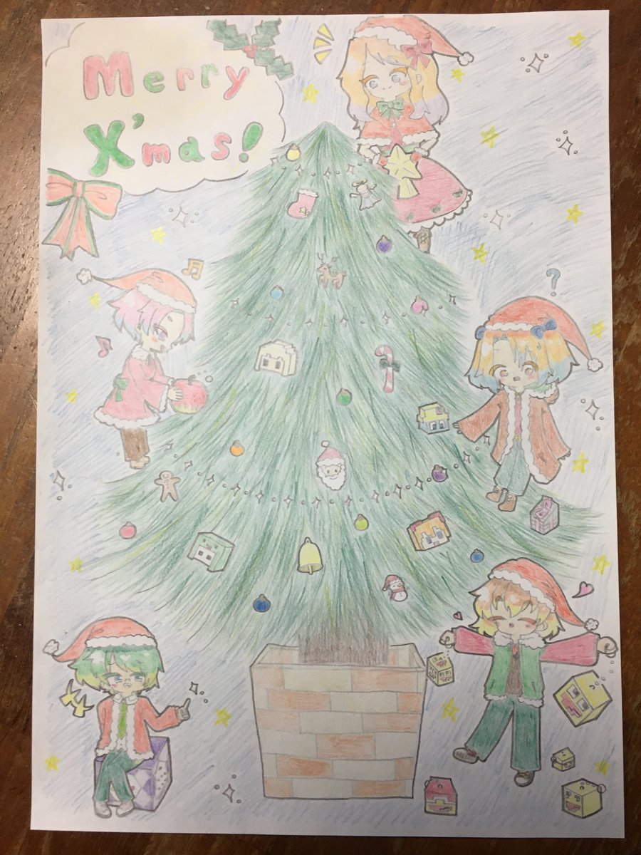 クリスマスツリーを飾る幼稚園組。🎄✨ メリークリスマス!!(ギリギリ) #50人イラフト #ろぜあーと #やちアート #わどるど #imo64アート #koutanアート