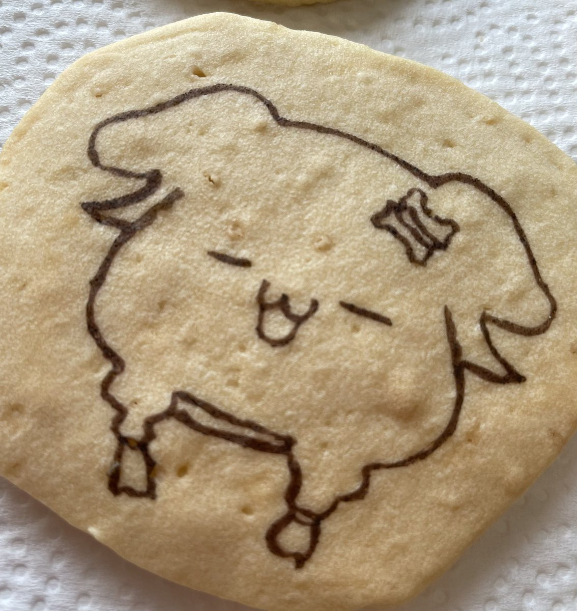 クッキー練習中🍪 フードペンの下書きはなかなか上手くかけたと思うけど、アイシングって難しいなぁ😑 余った生地でころねすきー作っとこうって何も見ずに切ったら、耳をそぎ落としてしまってた… #できたてころね
