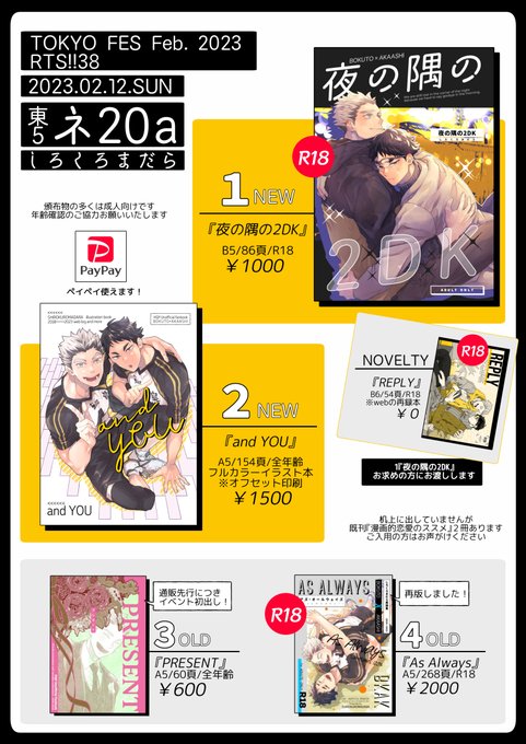 通販開始しています! 【新刊】 ■『夜の隅の2DK』漫画、ノベルティ冊子付き サンプルpixiv.net/artworks/10522… 🐯ec.toranoana.jp/joshi_r/ec/ite… ■『and YOU』フルカラーイラスト本 サンプルpixiv.net/artworks/10522… 🐯ecs.toranoana.jp/joshi/ec/item/… 既刊ツリーにぶらさげます→→