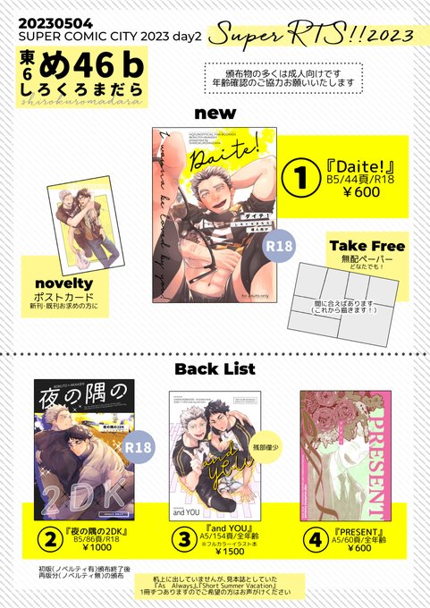 5/4(木)SUPER RTS!!2023お品書きとポスターです! 東4 め46b【しろくろまだら】 ■新刊『Daite!』会場頒布額¥600 サンプルpixiv.net/artworks/10731… 通販ec.toranoana.jp/joshi_r/ec/ite… ■ノベルティポストカード ■無配ペーパー(3頁漫画これから描く) ■既刊3種 サンプル・通販ツリーにつなげます