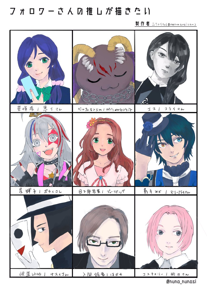 #フォロワーさんの推しが描きたい お待たせしましたのだ〜! 普段描かないキャラが多かったら新鮮だったのだ〜。 塗り残しとかあるのだ。ごめんなさいなのだ!