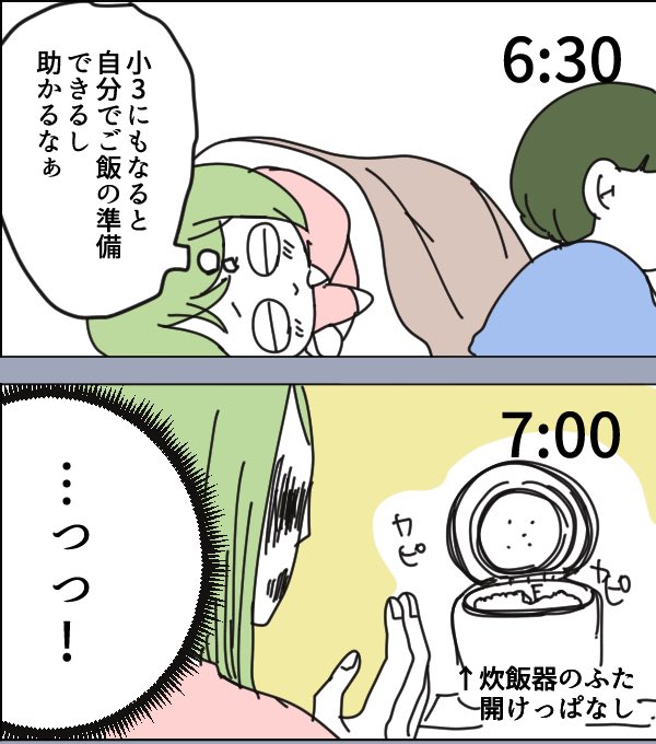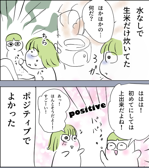 赤ちゃんだったネギさんの息子が米を炊いてるとか…と感慨深かったです。 実際ここでちゃんとほめたネギさんがファインプレーなんじゃないでしょうか… ポジティブって大事な要素ですが、チャレンジを見守る親の姿勢もありますよね 私、すーぐ怒っちゃうので笑 #漫画が読めるハッシュタグ