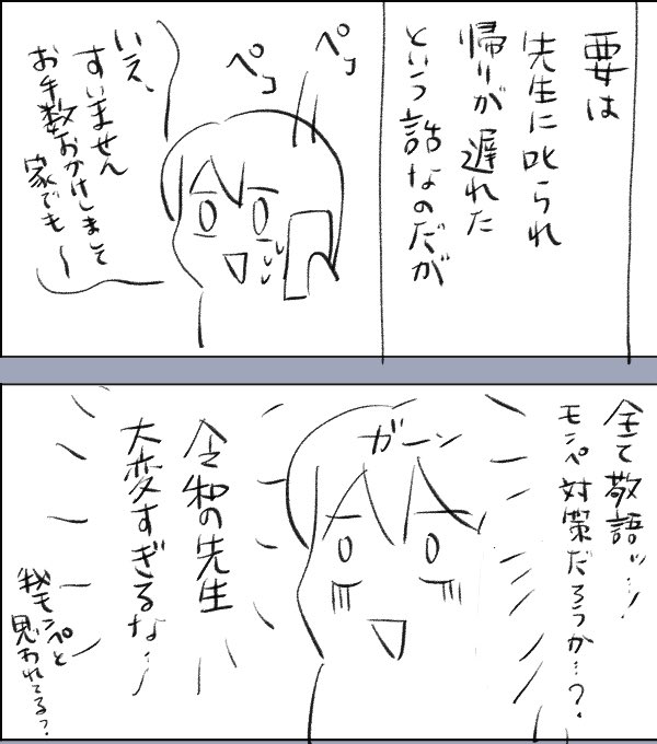 保護者に対して敬語なのはわかるんです、私のほうが年上だし私も敬語ですので。 でも子供に対してもなんだ?という そりゃあ私に話してるんだからそうなんだとは思いますけど、ここまで?という 徹底した気遣いの表現だったので衝撃でした。モンペ対策かなぁ #漫画が読めるハッシュタグ #育児日記