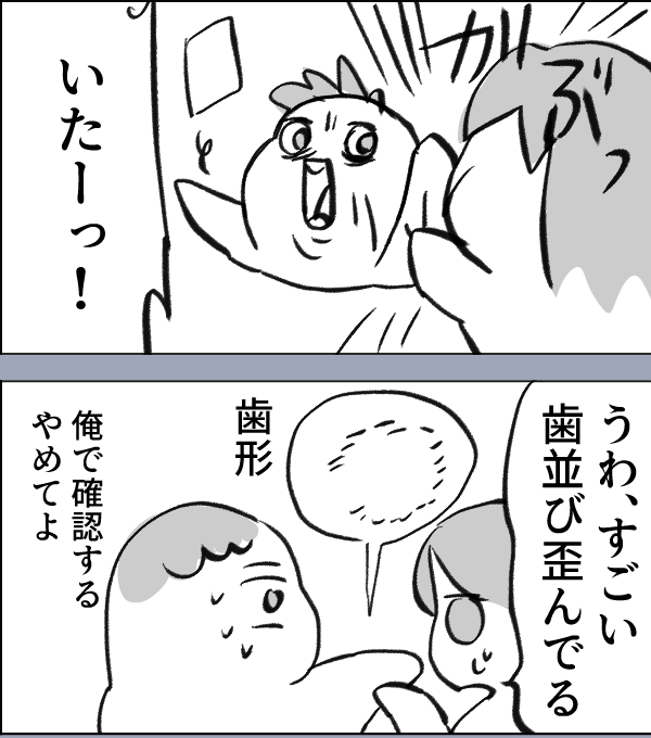 歯並びどんどんずれていってる気がします。 あと、噛んでから自分の腕で確認すればよかったと思いました。でも、前から見るときれいに見えるので、結構がたがたでへこみました。 歯列矯正するほどでもないんですよね…。 #漫画が読めるハッシュタグ #四コマ漫画