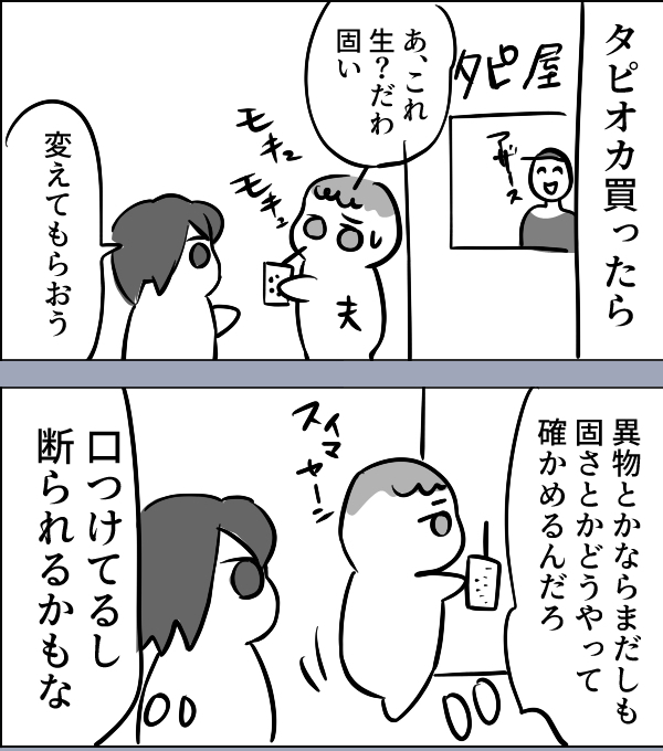 当時はタピオカミルクティーよく飲み肥えました。 実際どうやって確認するべきなのか。 そして、客のいいがかりだったらそれそのまま返すのか? それなら最初から飲まなくていいような? いろいろと謎のお店でした。 #漫画が読めるハッシュタグ #四コマ漫画