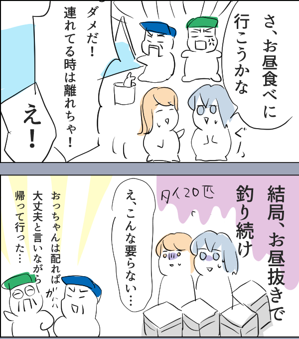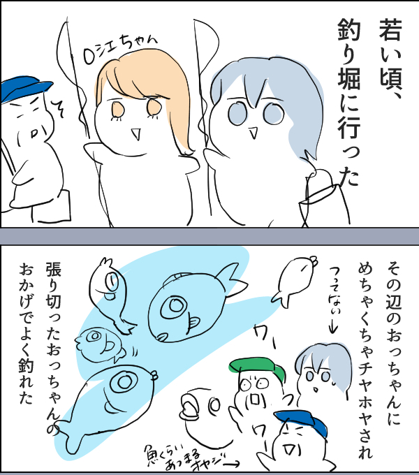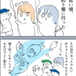 釣り堀の思い出。これたしか頑張って配ったんですよね、突然魚もらっても困るのに、みんな受け取ってくれてありがとうございました…。鯛って鱗でシンク汚れまくるし。私にはまだ早かったなと感じました。#漫画が読めるハッシュタグ