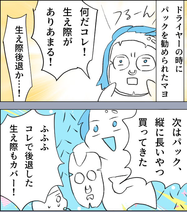 前回?パックに再チャレンジしてから続けております。やっぱり肌の調子がいいですね。いつも春は肌荒れひどいのですが、乗り越えられてます。 前回、後退した生え際部分にパックが足りないので長いのを買ってきましたが…?#漫画が読めるハッシュタグ
