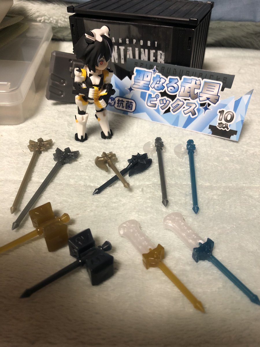 クソ久しぶりに #デスクトップアーミー の話。 最近100均のお弁当用コーナーに面白いピックが売ってるよねってやつで。 聖なる武具と暗黒の武具っていう面白いのを見つけたからちょっと加工してみた🤔 うん、良い感じ😌