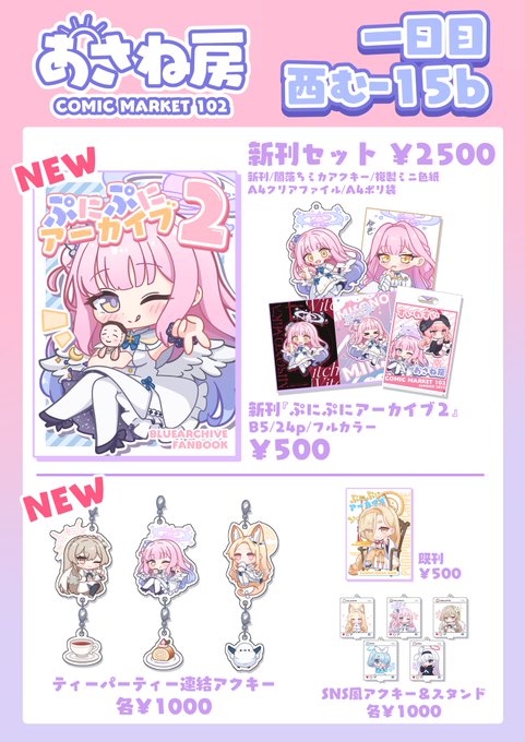 C102のお品書きです!! 新刊セットのアクキーと複製ミニ色紙は会場限定です! 以前頒布したアクキー&スタンドもティーパーティーとアロプラを持っていきます!! 当日はよろしくお願いします〜!!!✨️ #C102