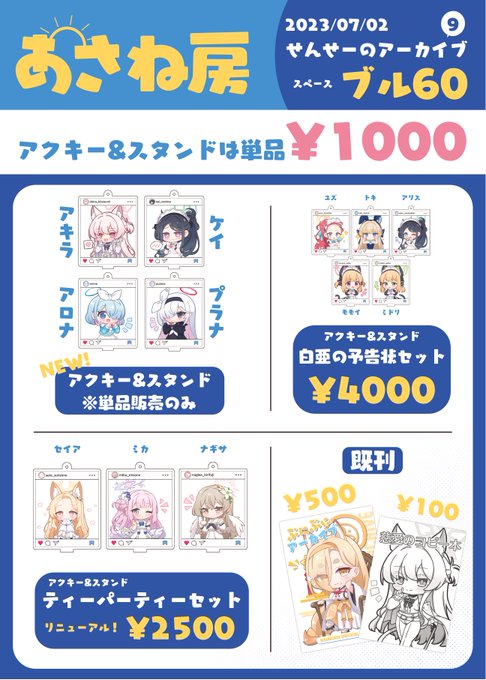55 65 せんアカ9のお品書きです!! 新作のアクキー&スタンドと前回頒布したティーパーティーセット、 白亜の予告状セットがあります! 当日はよろしくお願いします!! ※アクキー&スタンドはお一人様各一個ずつです。 お品書きデザイン:トルパスさん(@torupasu0620) 23/06/24 12:11