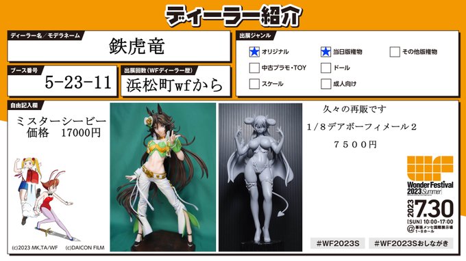 wfの卓番が出ましたので告知を ブースナンバーは5-23-11 鉄虎竜です ミスターシービーの再販とオリジナルの再販ですが、よろしくお願いします #WF2023S #ワンフェス2023夏 #ウマ娘