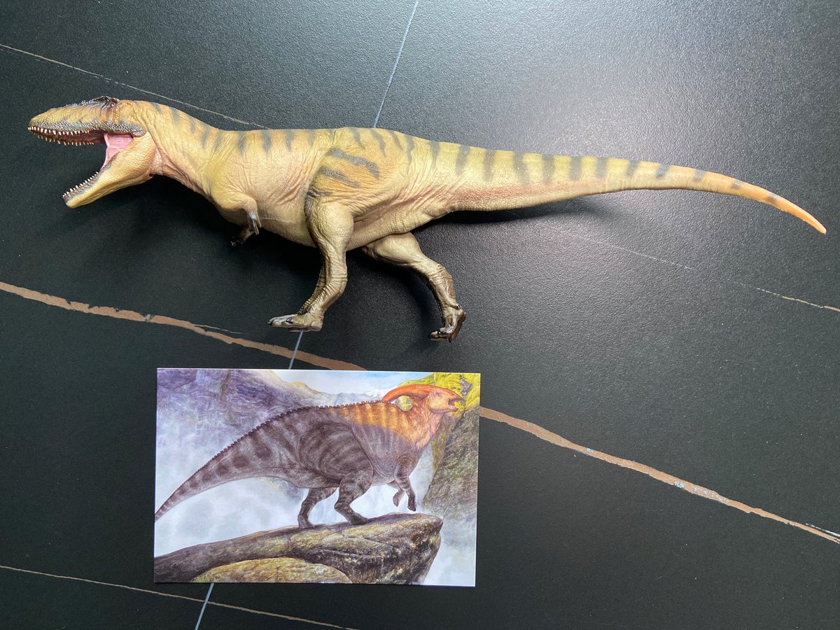 I made some new postcards to give away again....I’ll do this half of a year and continue to create more original works. (P3: Size comparison between card & PNSO Carcharodontosaurus; P4: Size comparison between card & my favorite book from my childhood🥰) #paleoart #watercolor