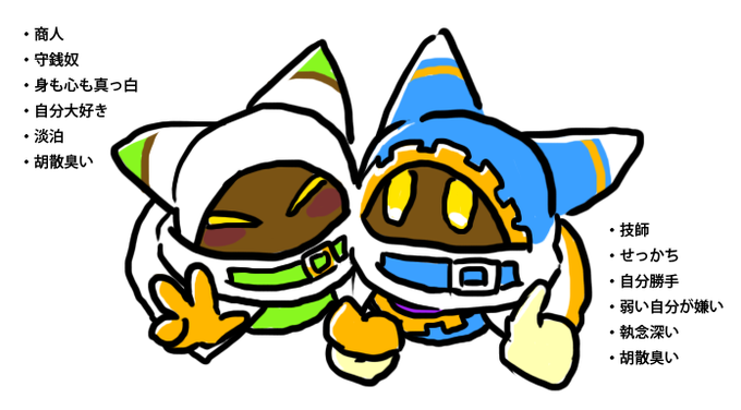 これは同一人物だと思ってなかった頃にかいたやつで 今の解釈とあんまし相違ないなーって思いながら眺めてたんだけど 夢を諦めてたマホロアと夢を叶えようと頑張っているマホロアなんだなって思うとこう…滾りますね