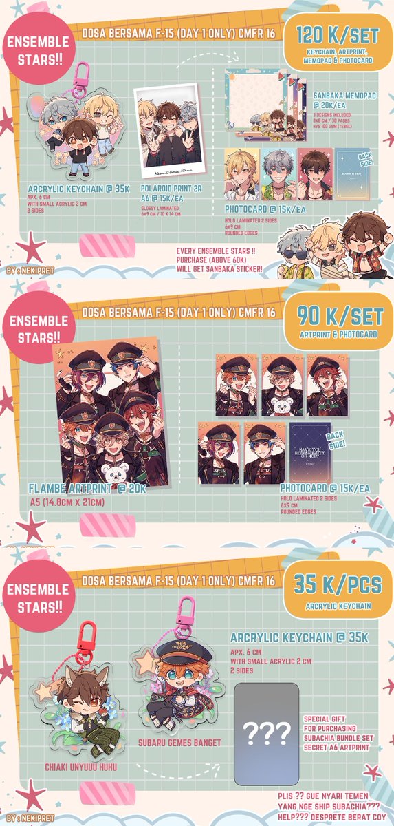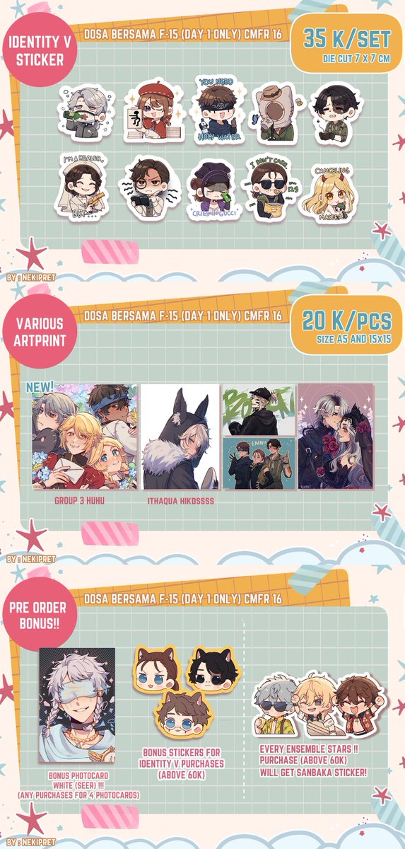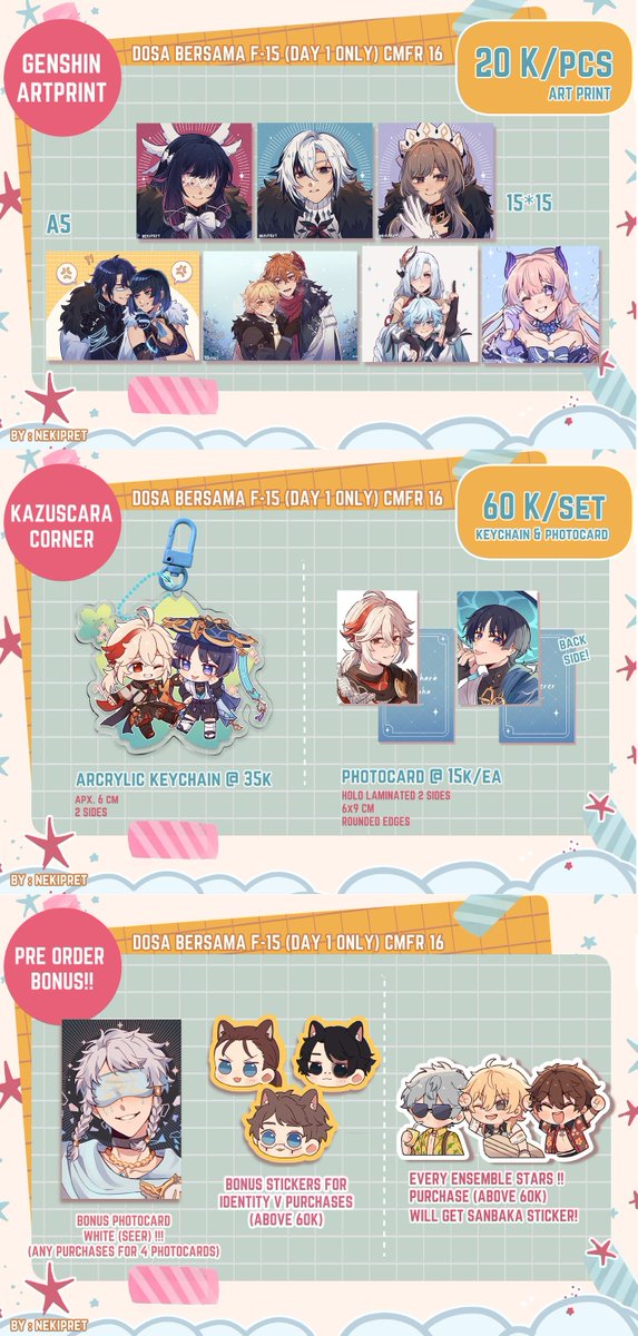 [RTs and like are appreciated💕🥰] Here is my catalog for #comifuro16 ! i'll be at F-15AB only Day 1! Come by and say hello🫶! Fandom: Identity V, Ensemble Stars, Genshin Impact 📅PO Closed: 9 April 2023 💁♀️PO Form: forms.gle/Q6v7Cd8nYwrW4X… Thank you! #CF16 #comifuro16