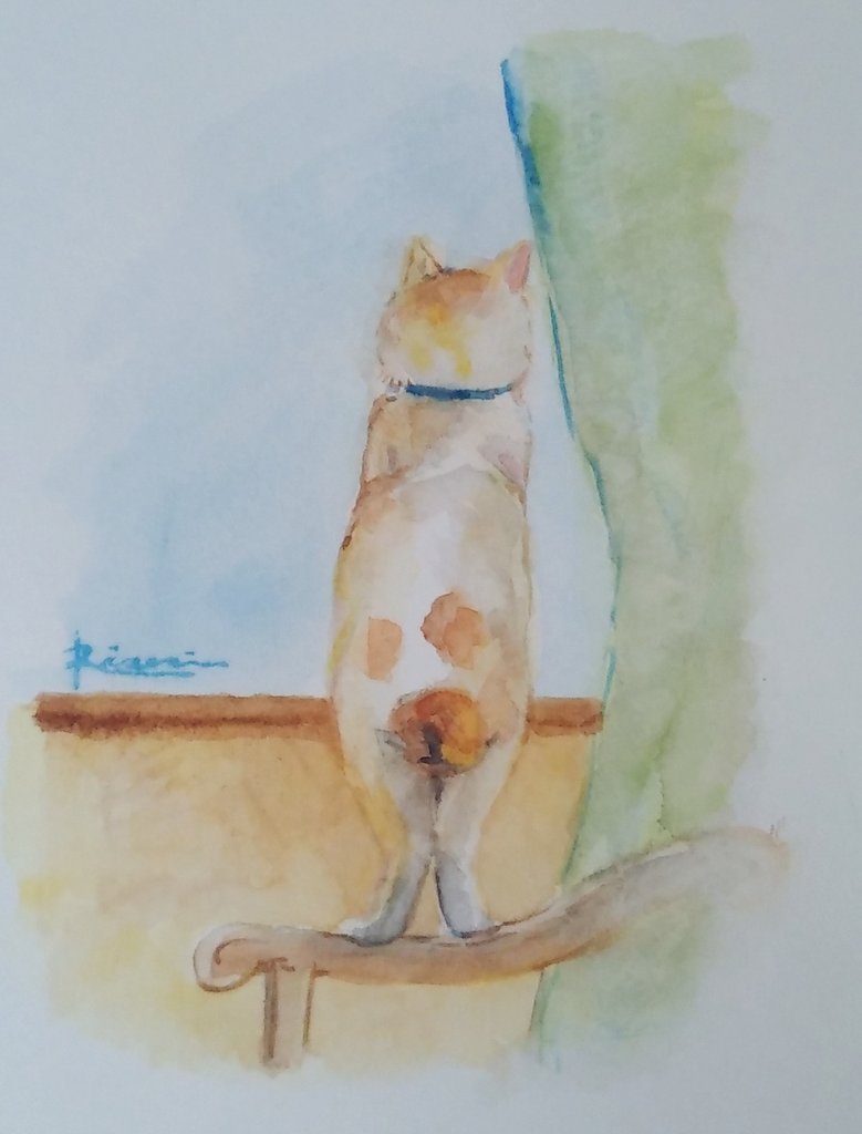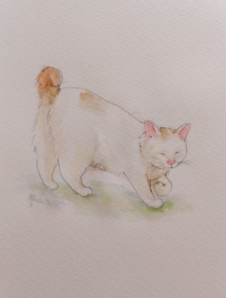 ちょっとバックの色が薄いのかなぁ〜 と、一昨日から思ってました。 やっぱり薄いかも。 #水彩画 #猫の絵