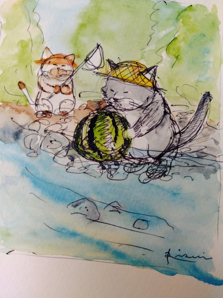 夏っぽい絵の下描き。 暑すぎてスイカ🍉描いちゃった。 #ねこ #水彩画 #絵 #猫の絵 #暑いので涼しげな画像を貼る