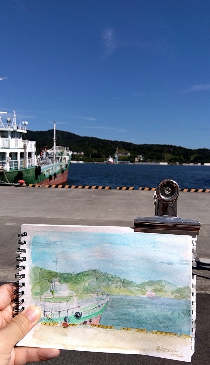 0 15 漁港にて。良いお天気とひとに恵まれ、久しぶりに外でスケッチ。 やっぱり現場で描くのが一番良い。 #水彩画 #絵 気仙沼駅前観光案内所のお姉さん、お陰様で描けました🎨ありがとうございました☺ 22/09/12 06:08