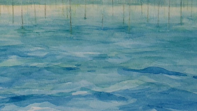 0 9 水張りを省いてパネルにマステ張りにしたら波打ちが半端なくなってしまった(¯―¯٥)急がば回れ。 👨🏼🎨春の海を描いています。 #水彩画 #絵 22/09/07 21:50