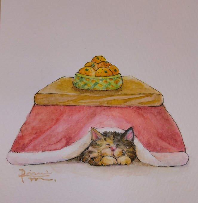 コタツでスヤァ……( ˘ω˘)スヤァ… #猫のいる暮らし #猫好きさんと繫がりたい #猫の絵 #水彩画 #絵