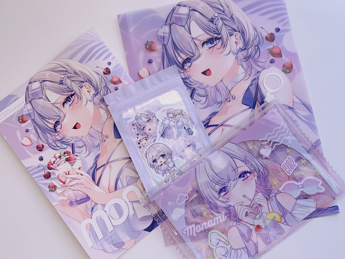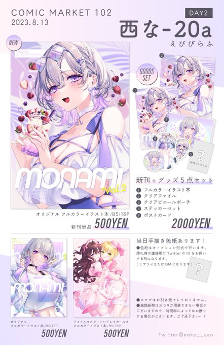 ┊ #C102お品書き ┊ フルカラーイラスト本とグッズセットがあります🍓 8/13(日)2日目 西1ホール 【な-20a えびぴらふ】にてお待ちしてます!よろしくお願いします! #C102 #コミックマーケット102