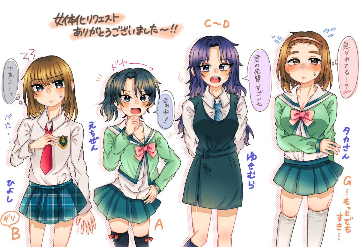 ⚠️女体化⚠️ このツイートでもらった4人描きました~🥰リプくれた方ありがとうございます🎶👯 募集しといてなんですがおおはしだけが楽しいオール自己解釈です…🥳 twitter.com/neko__world315…