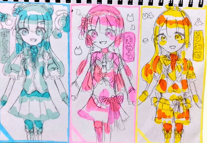 らなきゅらの新衣装最高だった...🤦♀️🤦♀️とりあえず足りないところもあるけどざっと描いたやつを投下😇 いつも以上に雑。(?) 下手なのは周知の事実。(?) 今見たら完全に自分の絵柄すぎて昇天した😇😇 #Yotsuh_Art #ぽんとれーと #むにゃーと #らなきゅら新衣装リレー