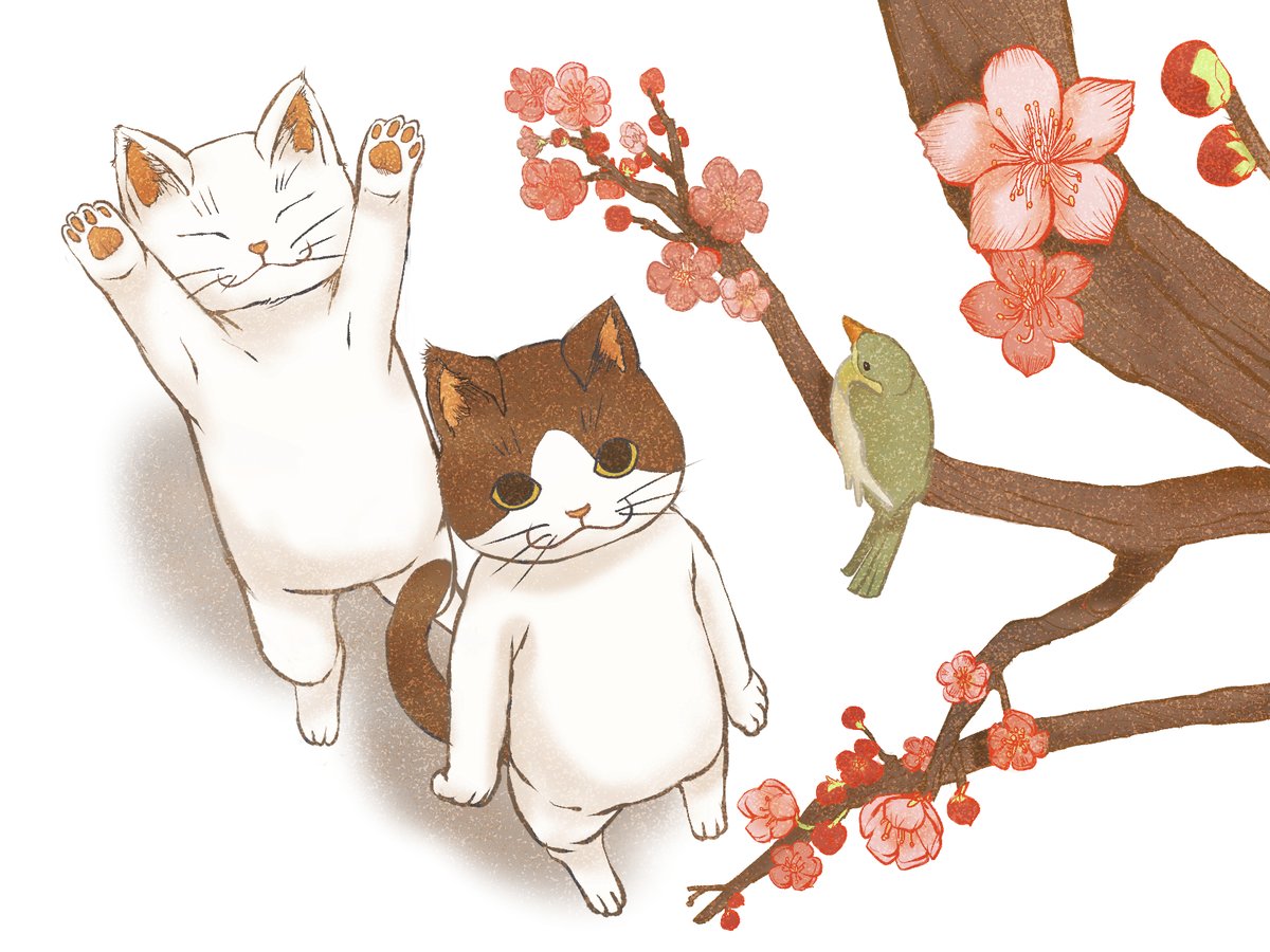 こちらは梅の花を愛でる体裁でウグイスを狙ってるネコたち。イラストACに載せてます。 ac-illust.com/main/detail.ph… #イラストAC #ネコ #梅の花