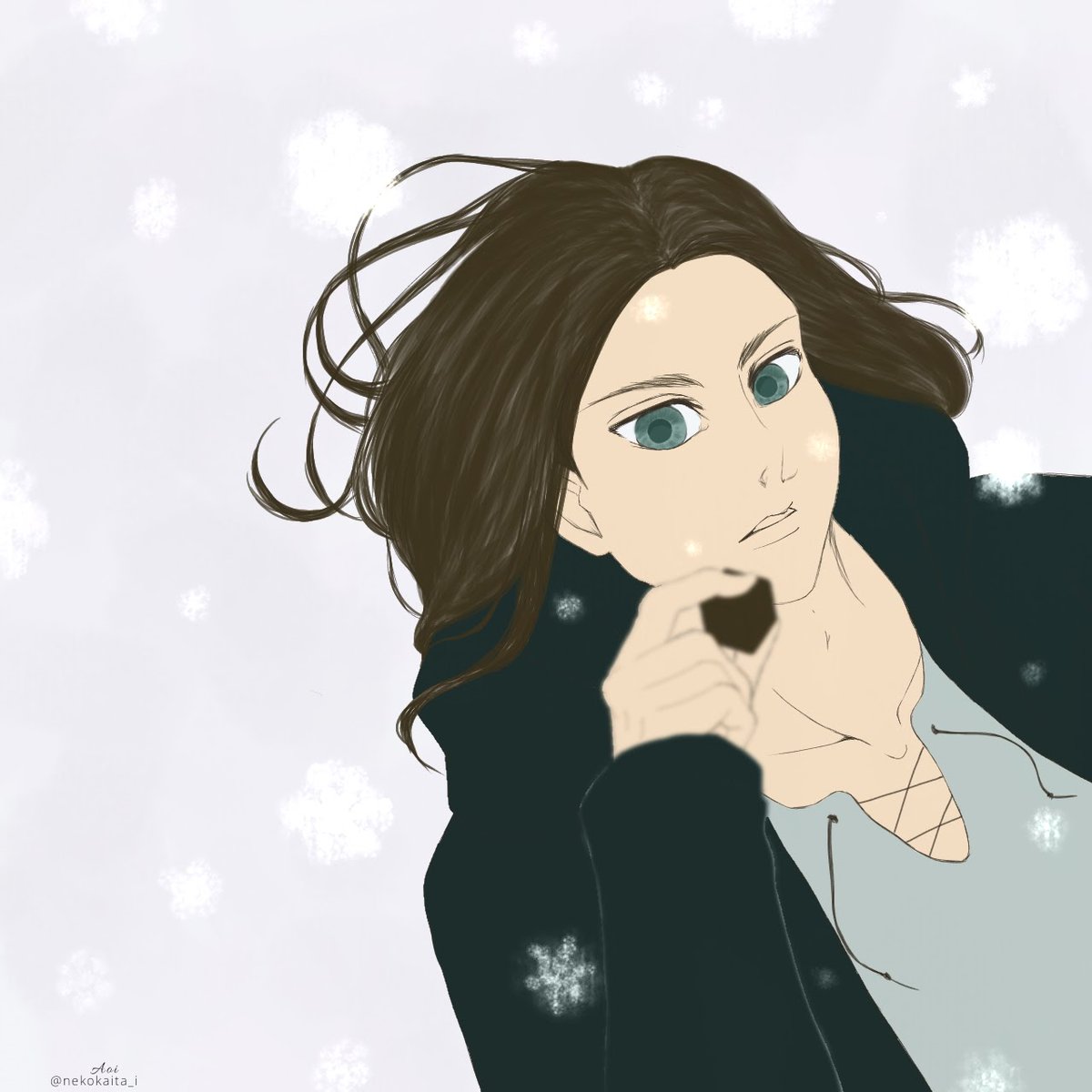 #エレン版深夜の真剣お絵描き60分一本勝負 お題「雪」 遅刻参加です。 2021/12/15 9:00〜10:10 ポーズ参考あり。 ふーゆーのKissは、雪ーのよーうな口どけ〜 色選びに無い頭使ってたら、陰影つけられなかった…