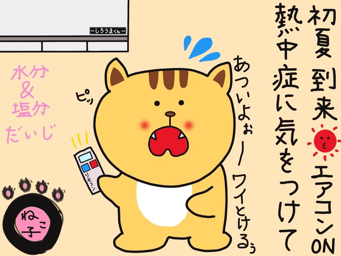 #イラスト #iPad #安納芋🍠カラーの謎の猛獣 【ワイ】 🎨ワイ、暑い‼️Version✏️ この時期気をつけたいのが #熱中症 キケンはあっという間にすぐそばに⁉️ エアコンかけて 水分&塩分補給 無理はダメ‼️ ※6月に描いた絵です #キャラクター #漫画 #絵 #癒し #kawaii #cute #MediBang #お絵描き #ねこ子