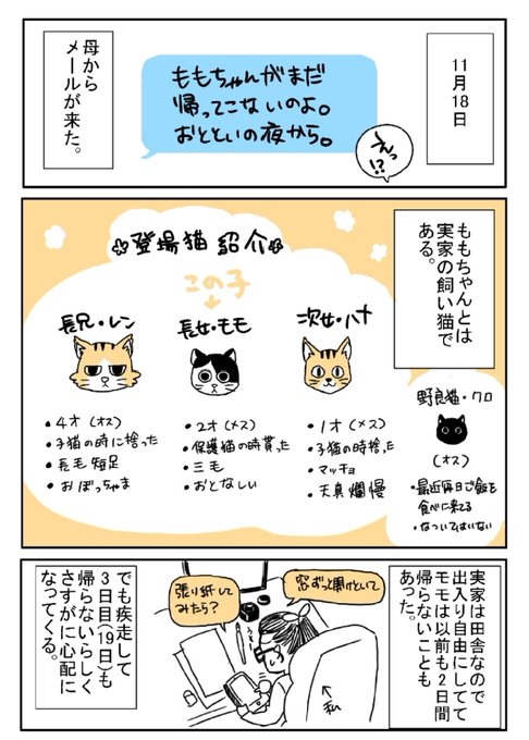 【失踪したうち猫が奇跡的に見つかった話🐱】 (1/4) 2年前の事件と漫画です。 #漫画 #創作漫画 #猫漫画 #ねこ #猫 #迷い猫 #迷子猫 #猫捜索 #行方不明 #猫のいる暮らし #猫好きさんと繋がりたい #漫画が読めるハッシュタグ #絵描きさんと繋がたい #絵師さんと繋がりたい
