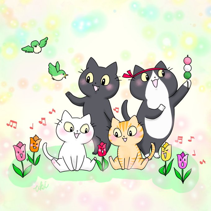 3 52 🐱チューリップさんとみんにゃで大合掌にゃ😆💕ジジは鳥さんとも仲良しにゃ🐦オタにゃんはお団子への愛を歌ってるにゃ😂🍡 #ねこイラスト #猫イラスト 22/03/22 22:47