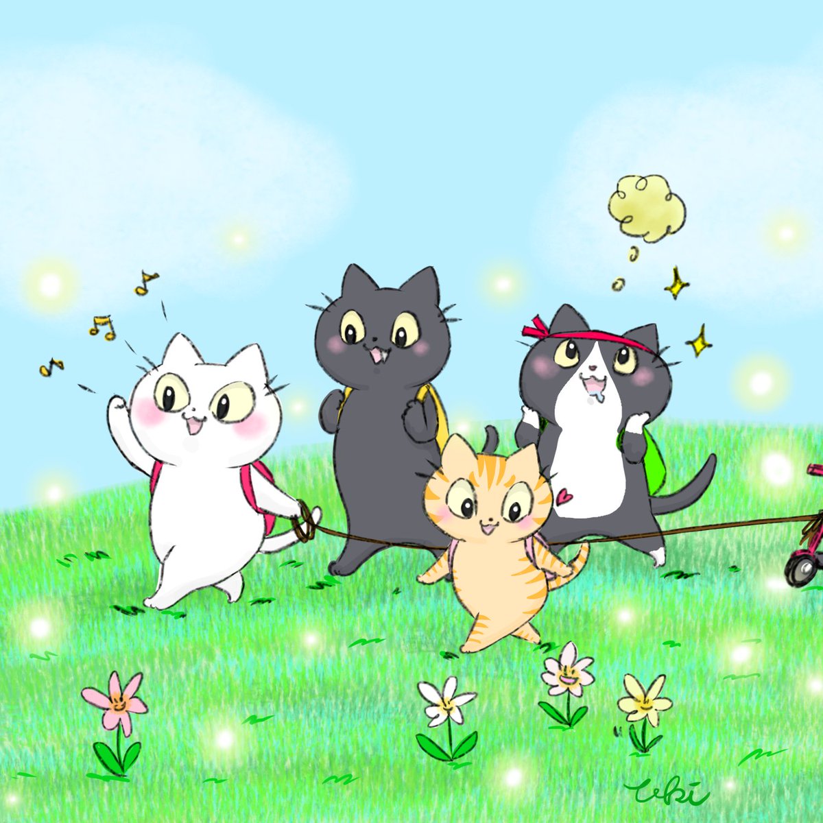 もうすっかり桜も満開です😍🌸ちびにゃんずがわちゃわちゃ遊んでたら楽しいな~🤭💓💓💓 #ねこイラスト #猫イラスト