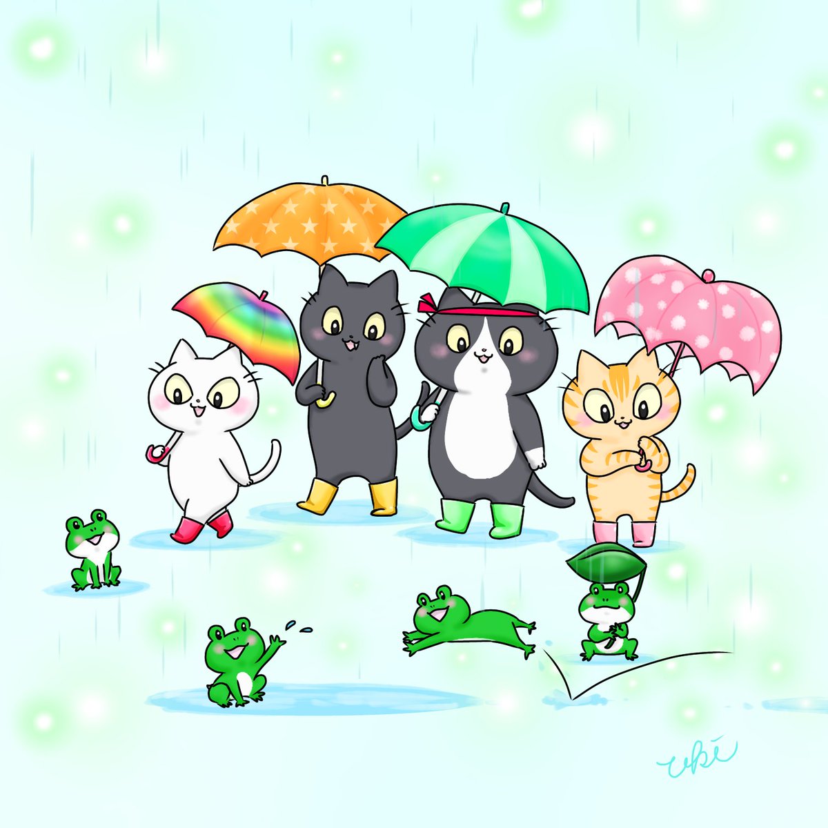 🐱雨の日も楽しい出会いがあるにゃよ⋆̩☂︎*̣̩🌟✨💓 #ねこイラスト #猫イラスト