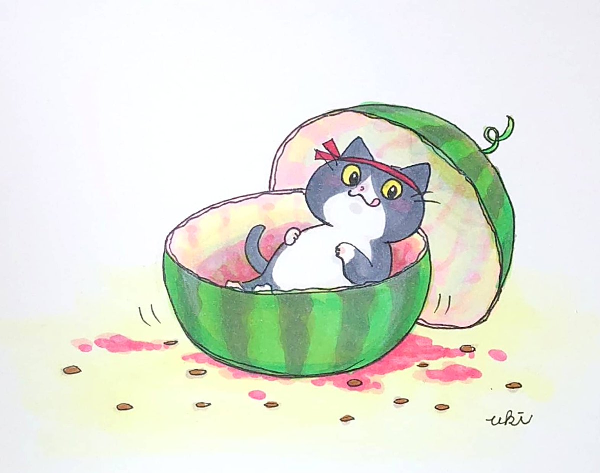 4 30 今年はスイカ食べる率が高い🍉😋💓 お久しぶりです🐱🍉毎日暑すぎます🥵 スイカの水分がめちゃ浸透する✨ オタにゃんは1人で食べちゃいました🍉 #ねこイラスト #猫イラスト #アナログイラスト 22/08/25 09:12