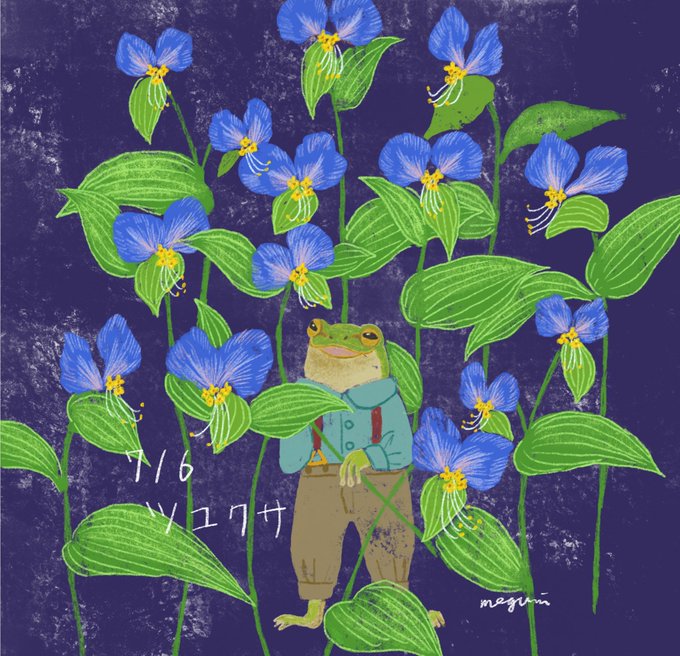 7月6日の誕生花はツユクサです。花言葉は尊敬 風邪をひいてしまいました😰ここ2年ほどひいてなかったのでこんなしんどかったっけ💦って感じです😷💦 #絵本 #挿絵 #イラストレーター #イラストレーション #絵柄が好みって人にフォローされたい #夏の創作クラスタフォロー祭 #カエルイラスト