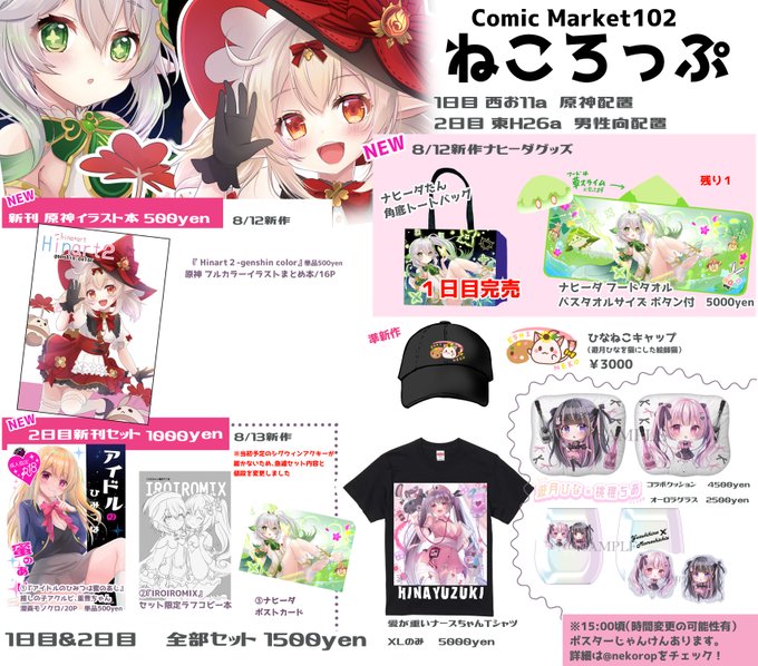 ねころっぷ 2日目 お品書き変更しました!ご確認よろしくお願いします🙏見つけたフードタオル急遽2日目販売で残1、桃稚ちあさんとのコラボグラスも残1、ナースちゃんTシャツ残4、キャップ残3です🌻 twitter.com/nekorop/status…