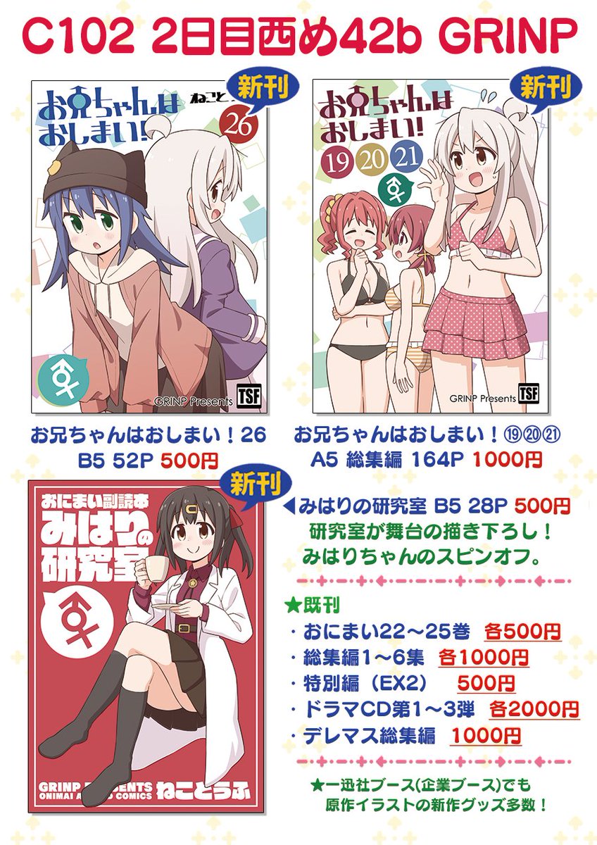 夏コミ2日目【西め42b GRINP】お品書きです。 目玉は描き下ろしのみはり本。5月末に出したペラ本(生えちゃう話)の内容も収録しています。 書店委託はこちら、予約受付中!BOOTH通販やDL版も販売します。 虎の穴:ecs.toranoana.jp/tora/ec/cot/ci… メロン:melonbooks.co.jp/circle/index.p…