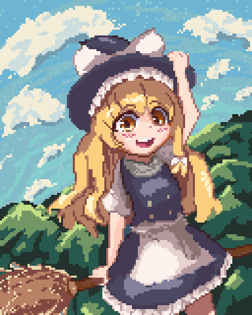 ドット絵で魔理沙を描きました!キャラがいい感じに描けたのと空がお気に入り(自画自賛) #pixelart #ドット絵 #東方 #絵描きさんと繋がりたい #絵柄が好みって人にフォローされたい