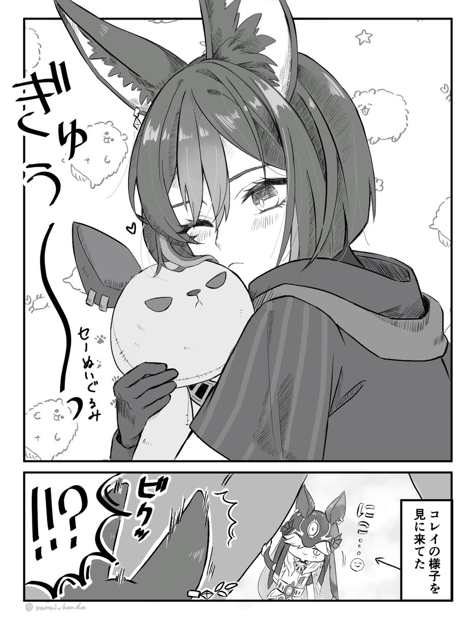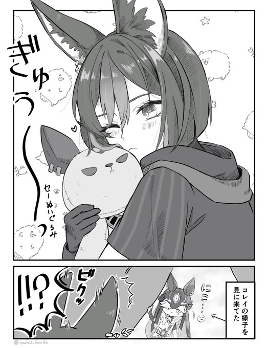 ぬいぐるみ抱きしめるとストレス解消するっていうからね。 ぬいぐるみ製作者はもちろん師匠の弟子ちゃん #cynonari