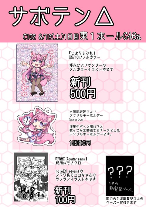 【C102お品書き】 8/12(土)1日目 東1ホールG46a「サボテン△」 新刊こよ🧪のフルカラーイラスト本とアクリルキーホルダー、フワモコちゃん🐾のモノクロラフイラスト本が出ます! 各頒布物の詳細は引用のツリーを見てください twitter.com/nemuke_aru/sta…