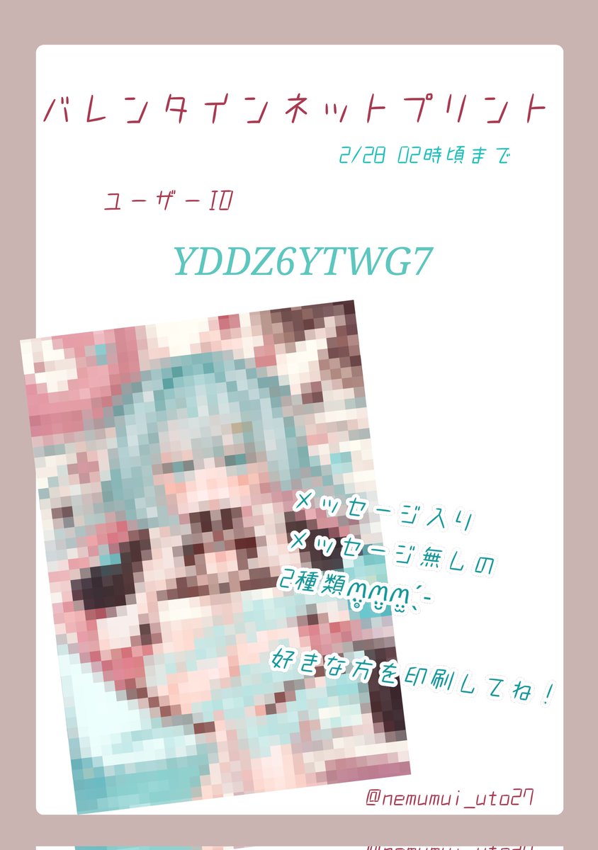 今日の21時に投稿する予定のバレンタインイラストをネットプリント登録しました! 今回はなぜかうとからのメッセージ入りと無しの2種類あります̗̀ ꪔ̤̥ꪔ̤̮ꪔ̤̫ ̖́- ほんとに大した事なんにも描いてないので期待しない欲しい #イラスト #ネットワークプリント #バレンタイン
