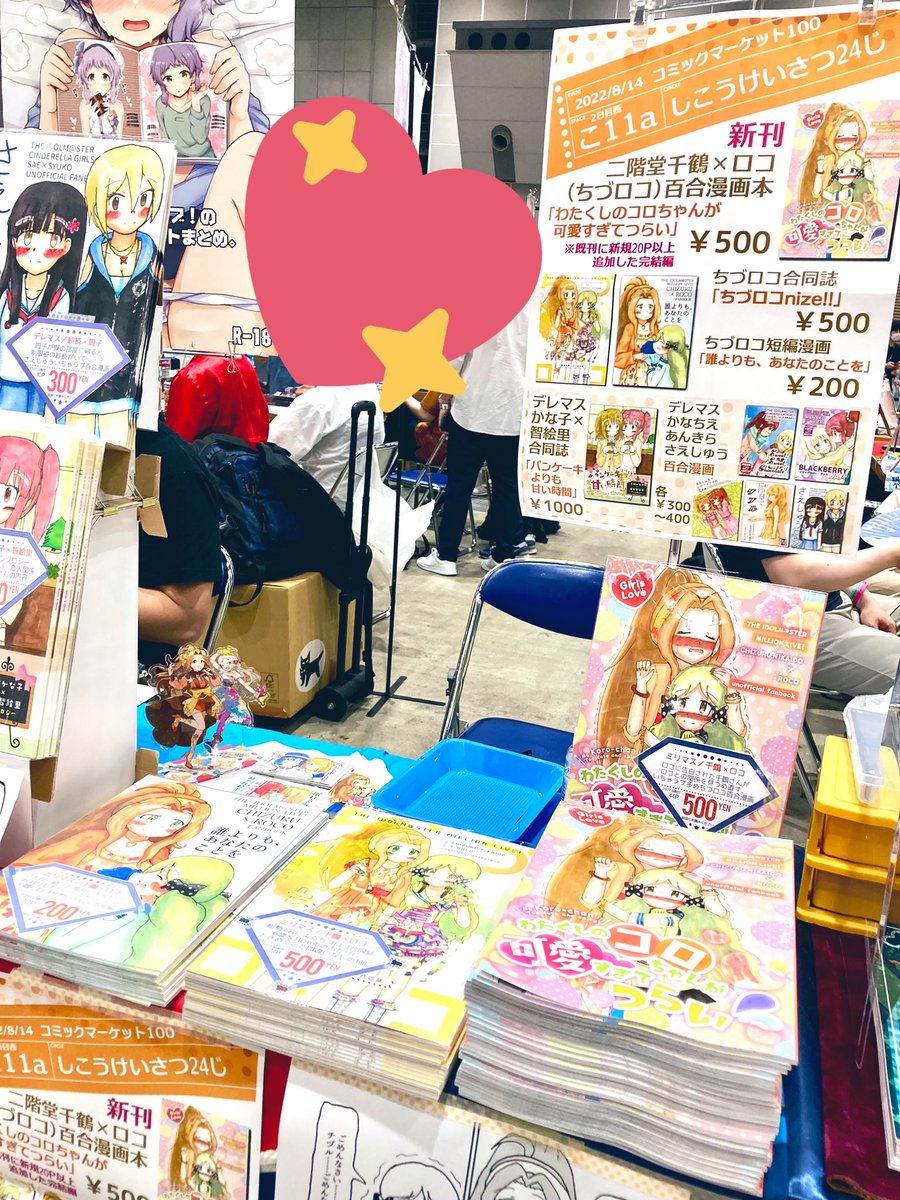 コミックマーケット100、設営完了しました! 西2ホール・こ11a 『しこうけいさつ24じ』にて、 アイドルマスターミリオンライブ! 二階堂千鶴×ロコ(ちづロコ)百合漫画や、 デレマスかなちえ/あんきら/さえしゅう 百合漫画を頒布しております! お誕生日席!! よろしくお願いしますー!🙇♂️ #C100 twitter.com/nemureruusagi0…