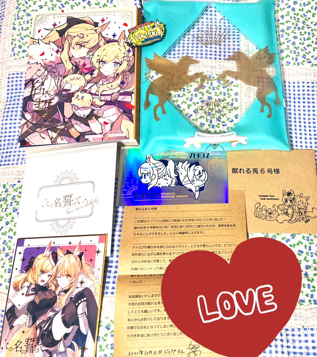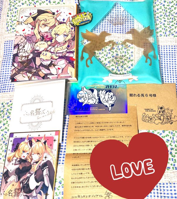 カラーイラストで参加させていただいた、ドックさん様主催のマリゾフィ合同本「この名に誓って」の献本をいただきました! 本も装丁もノベルティも、とんでもなく豪華で震えております…!! お手紙までいただけて本当にありがたい…!😭🙏 ありがとうございます!!🙇♂️ 通販もされているのでぜひ!! twitter.com/mariaxzofia/st…