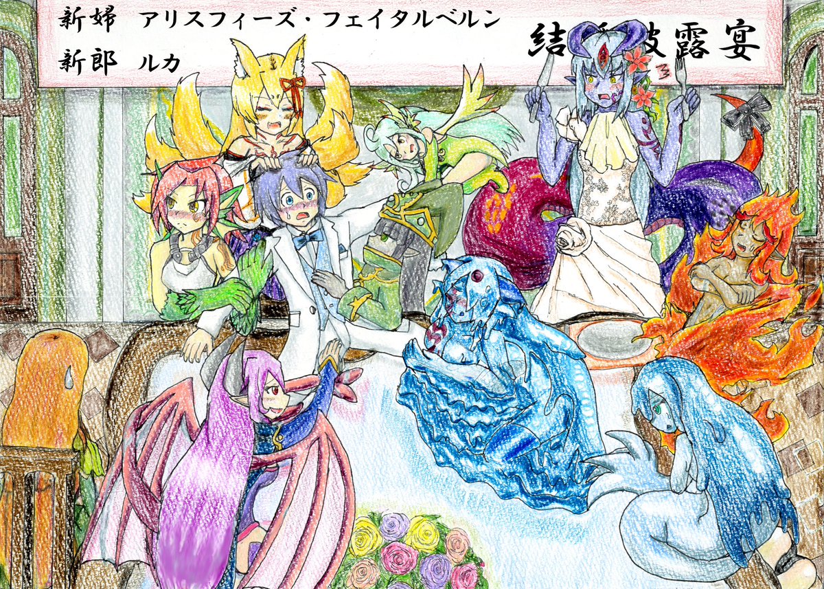 ナナドラオンリー開催、おめでとうございます&ありがとうございます!🐲🙏 過去絵を再掲いたします! tksさんの設定集アンソロに寄稿させていただいた2020自ギルドバンド絵と、無印自ギルド2人×2組の絵です!🎸 #7Dエアオンリー2 #7Dエアオンリー2_Day2