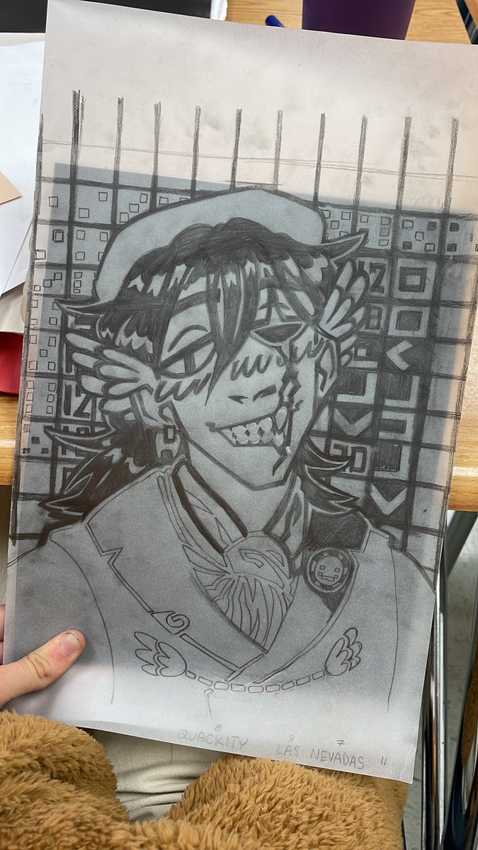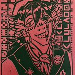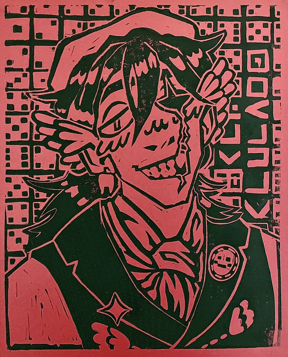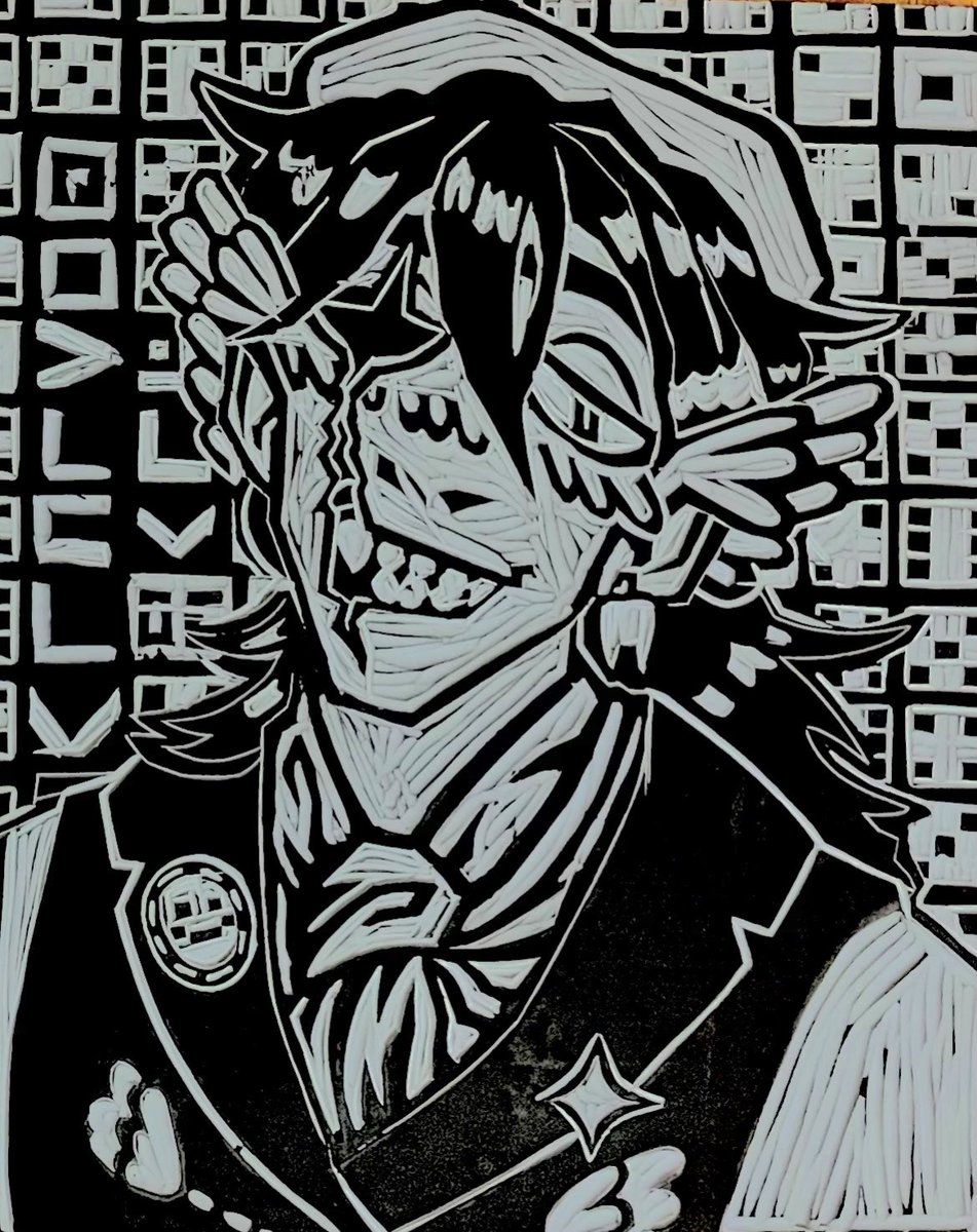 FINALLY. After days of carving the stamp, (and a few bandaids on my fingers from miscuts) i've finished the Quackity print!!! Here's the final, the stamp, and the first sketch. #quackityfanart #quackity #linocut #dsmpfanart