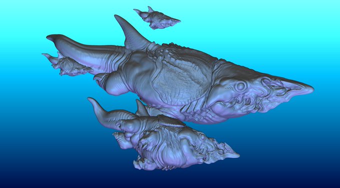 19 82 マカラ(インド神話の怪魚です) サメと甲冑魚などを参考にしてます。太古の生き物感を出していきたいです。 ワンフェスに間に合えばで3Dプリンターの出力品(小さいサイズ)で準備できればと思っています。 #WF2023W #ワンフェス 23/01/30 22:45