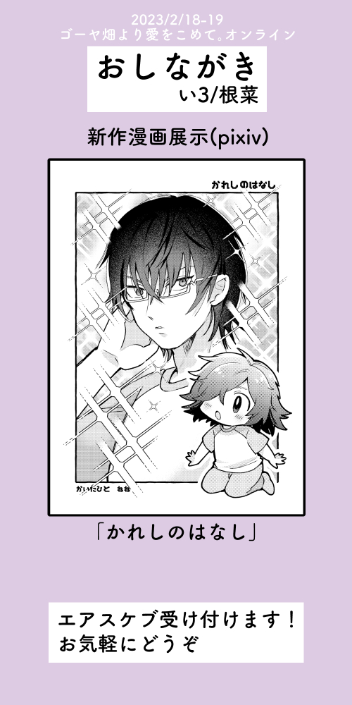 0 6 明日のwebオンリー@go_ya0129さんに参加します!おしながきです!短編漫画の展示をします!エアスケブも受け付けます!ペーパーラリーにも参加します!是非!! #webゴーヤ 23/02/17 22:49