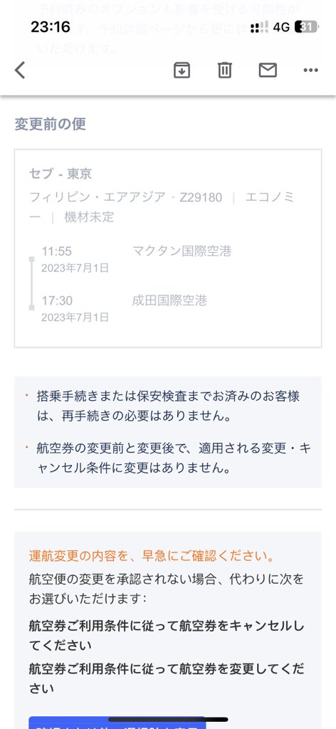 52 106 めちゃ伸びてるので補足… LCCなのである程度のことは折り込み済みですが、今回の変更はさすがに…って思ったので愚痴ってしまいました🙇♀️ 治安の悪いマニラで夜10時間、キャリーケース持ったままうろうろするのは無理オブ無理だと思ったのでキャンセルして4万払って別の航空会社で取り直してます…🙇♀️ 23/06/27 14:10