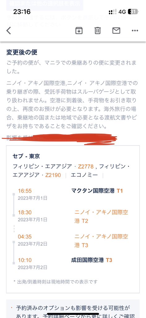 めちゃ伸びてるので補足… LCCなのである程度のことは折り込み済みですが、今回の変更はさすがに…って思ったので愚痴ってしまいました🙇♀️ 治安の悪いマニラで夜10時間、キャリーケース持ったままうろうろするのは無理オブ無理だと思ったのでキャンセルして4万払って別の航空会社で取り直してます…🙇♀️