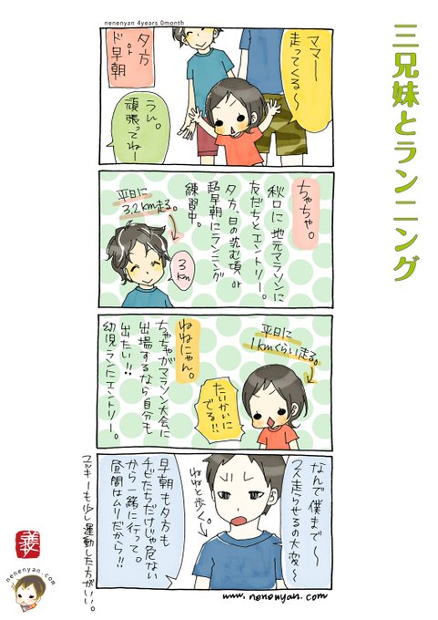 【519話】3兄妹とランニング 【520話】4歳0ヶ月とRUNラン倶楽部 他の4コマ漫画やブログ、実写動画は👇🏻✨ nenenyan.com Kindleで無料の電子書籍出版してるので、まとめ読みはそちらでもどうぞ👇🏻✨ amzn.to/3lpQNC8 #スーパーねねにゃん #育児漫画 #漫画